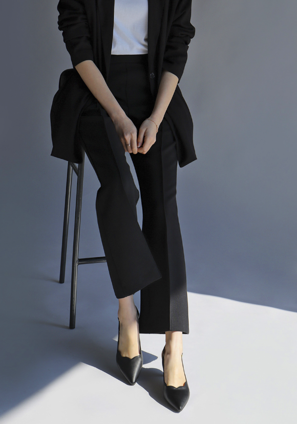 발등과 발 옆 라인에 여성스럽고 유니크한 '물결 웨이브' 컷팅 디테일이 적용되었습니다. 이 섬세한 디테일이 룩에 로맨틱하고 세련된 무드를 더하며, 발등을 얄쌍하게 보이도록 합니다.