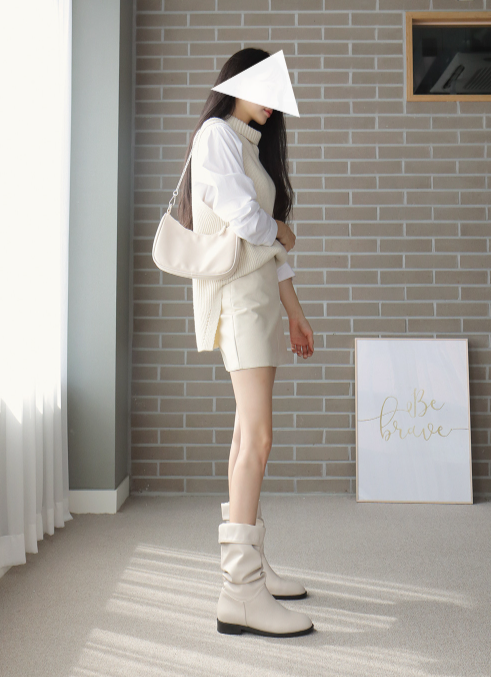 롱부츠와 미들부츠의 중간 길이감으로 종아리 중간 정도까지 올라오는 자연스러운 길이입니다. 맨다리에 신으면 루즈한 핏이 종아리 라인을 얄쌍하고 곧게 보이게 하는 '여리핏' 효과를 선사합니다. 통통 종아리도 편안하게 커버해주는 넉넉한 통입니다.