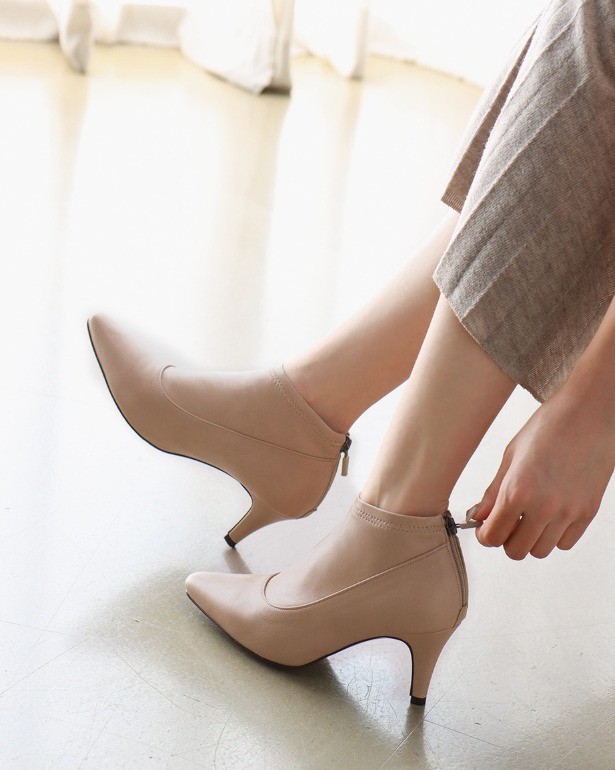 세련된 슬림 각코 라인이 발을 얄쌍하게 보이도록 하며, 깔끔한 백지퍼 디테일은 시크한 뒷모습을 완성합니다. 지퍼 덕분에 탈착화가 간편하며, 발목까지 이어지는 라인이 군더더기 없이 매끈합니다.