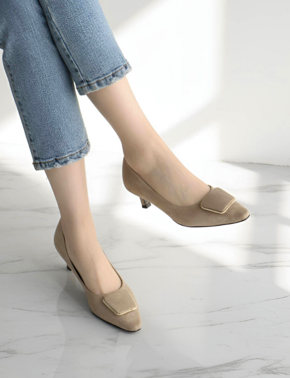 단정함 속에 숨겨진 세련된 디테일! 바닐라슈 [르엘르 2가지 소재 사각장식 각코 베이직 펌프스(5cm)]는 국내 수제 제작으로, 사각 금장 장식을 더해 고급스러운 무드를 연출하는 데일리 펌프스입니다.