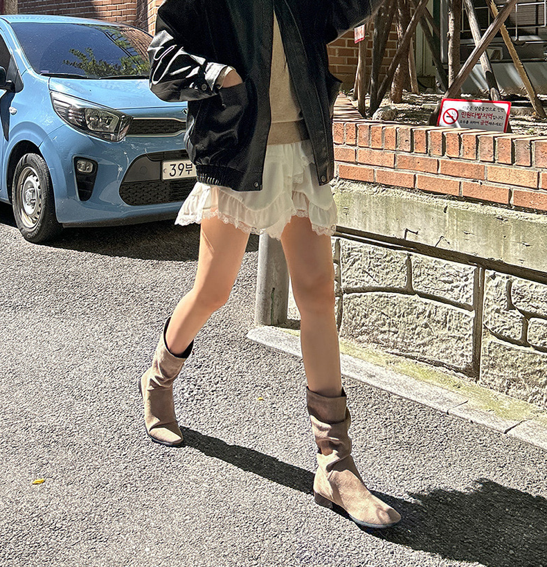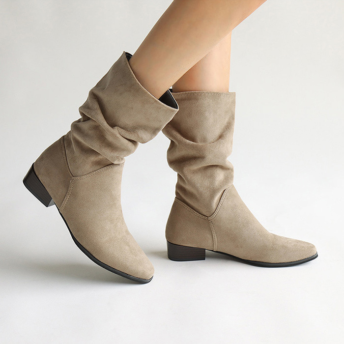 발목부터 종아리까지 여유감 있는 통 둘레로 지퍼 없이도 부드럽게 신고 벗기가 가능합니다. 부드러운 터치감의 스웨이드 소재가 발을 소프트하게 감싸주어 착용감 또한 뛰어납니다.