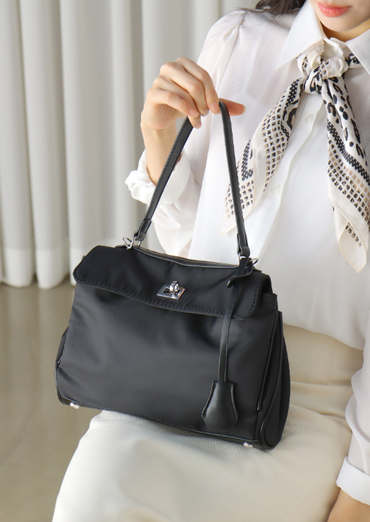믹스매치: 트렌치코트나 블레이저 등 포멀한 룩에 나일론 소재의 가방을 매치하여 딱딱함을 덜어낸 쿨하고 세련된 믹스매치를 시도해 보세요.
